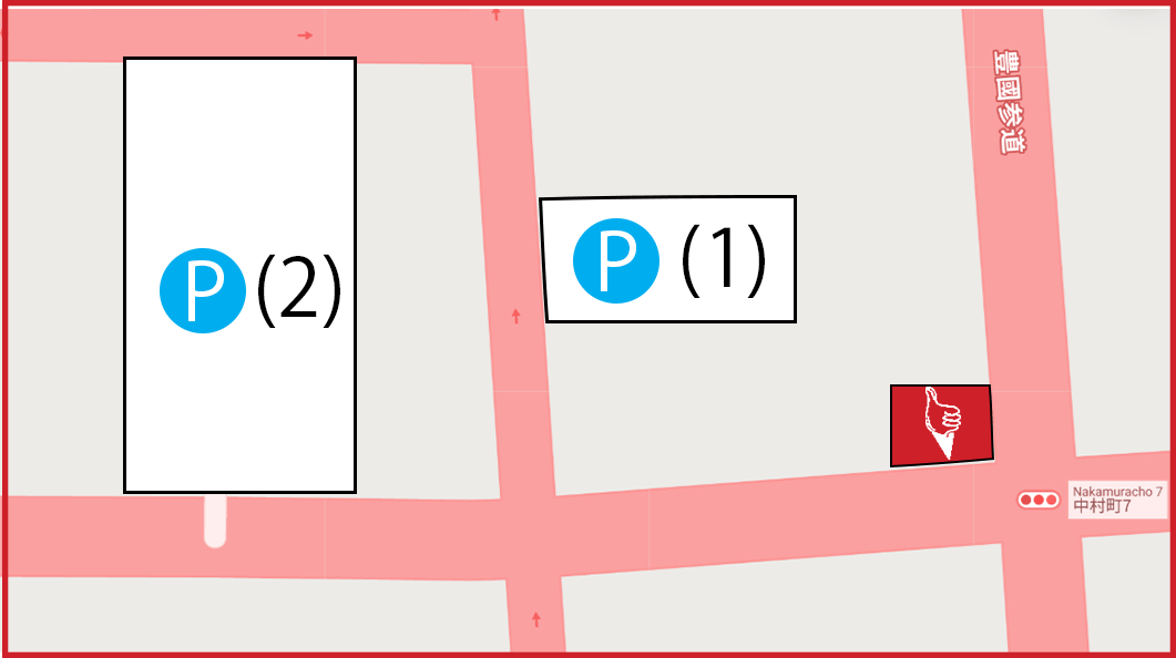 【車でお越しの場合】 (1) の契約駐車場が空いていない場合は (2) の北林病院の駐車場をご利用ください。 ※当店で1,000円以上ご利用で駐車券をご提示いただけましたら、 100円キャッシュバックさせていただきます。
